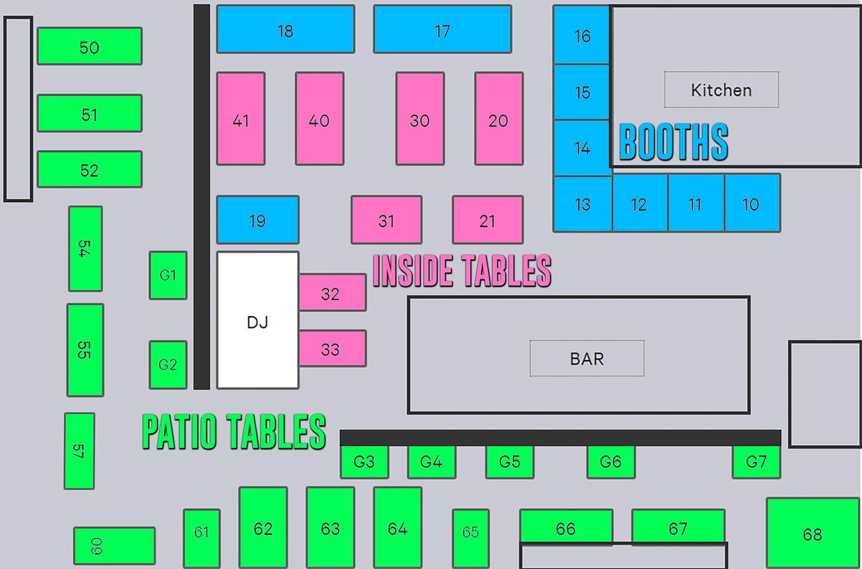 Tables are priced PER PERSON at $10 per seat INSIDE and OUTSIDE (Patios have heat)