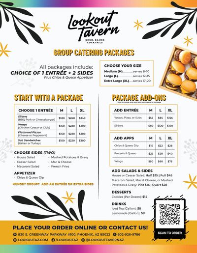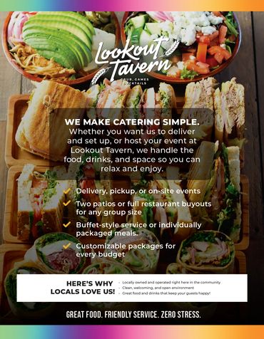 We’ll bring the party to you with delivery and setup, or you can let us host at our place — on one of our patios or in the full restaurant if you’re really going big. Either way, you’ll get the same Lookout flavors everyone loves, without lifting a finger (or washing a single dish).