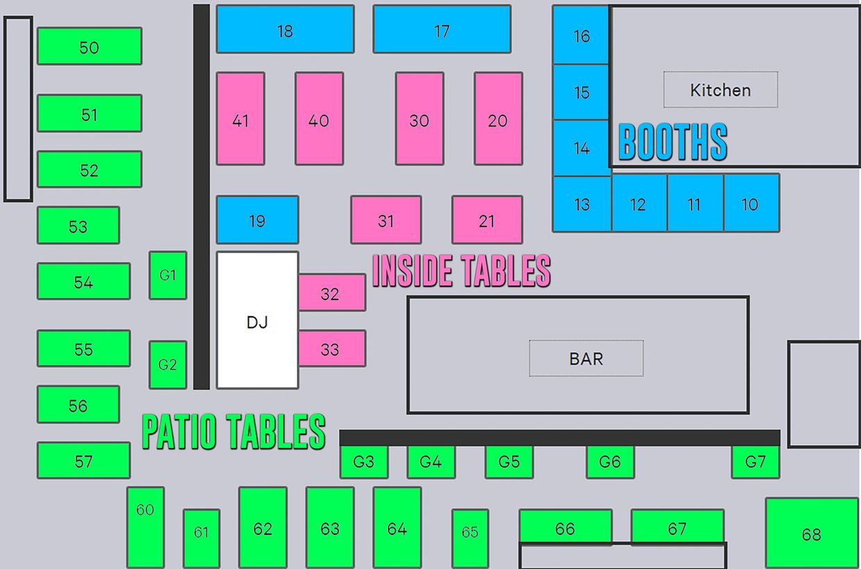 Tables are priced PER PERSON at $10 per seat INSIDE and OUTSIDE (Patios have heat)