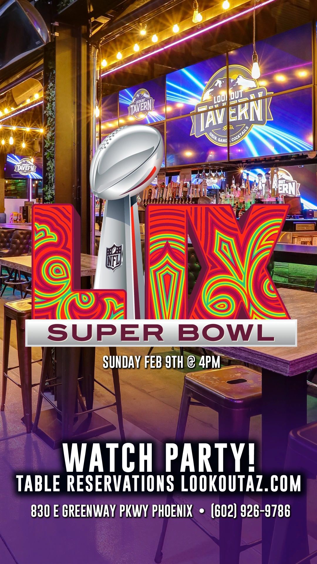 #SuperBowlLIX #LookoutTavern #WatchParty #PhoenixEvents #GameDayVibes #FootballFans #BestSeatsInTown