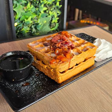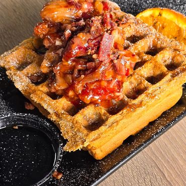 Two housemade sweet potato waffles topped with peach marmalade, crispy bacon, whipped cream, and Bourbon Barrel Aged maple syrup.