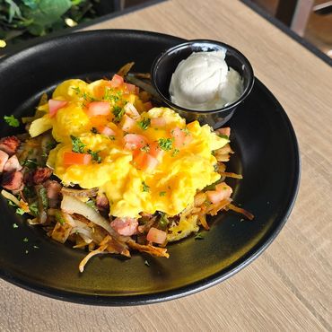 All the Denver vibes in one bowl. Ham, peppers, onions, scrambled eggs, melted cheese, and a side of sour cream. On top of hash browns.