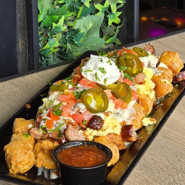 Crispy tots piled high with scrambled eggs, sausage, queso, bacon bits, tomatoes, jalapeños, jalapeño crema.